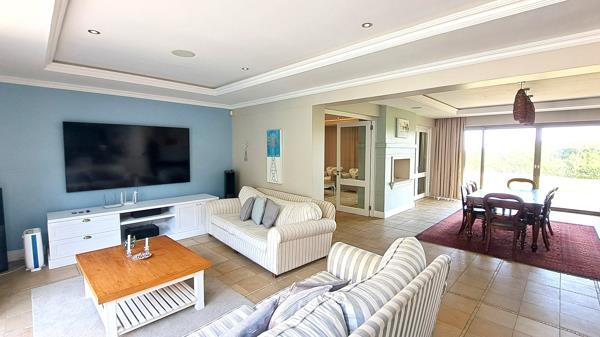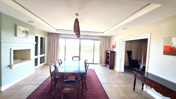 The dining room and lounge are interconnected through a universal fireplace, creating a cozy ambience. The dining room opens up to the back garden, perfect for entertaining and enjoying alfresco meals.