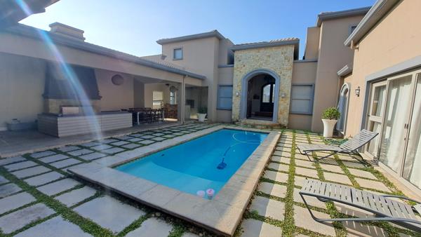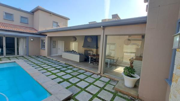 Spend your days basking in the sun by the private pool, equipped with a built-in gas braai for delectable outdoor cooking and gatherings. Also included are two garages, providing ample parking and storage solutions.