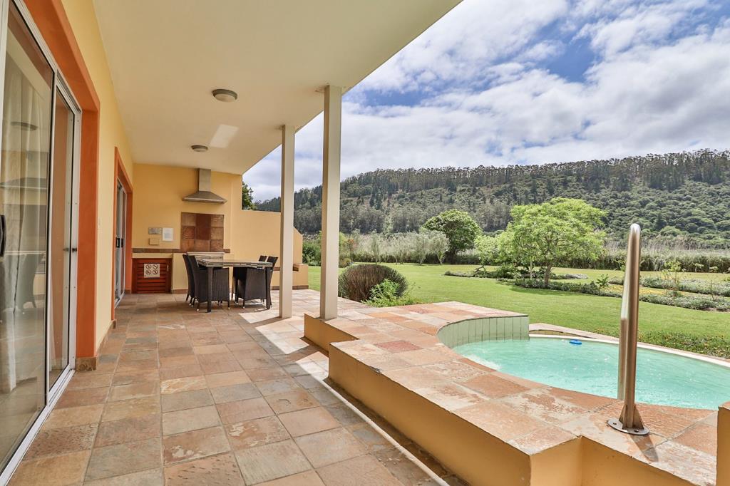 Discover the perfect blend of luxury and tranquility in this stunning north-facing villa, offering direct water access to Groenvlei Lake. Designed for effortless living, this spacious home features open-plan living areas that seamlessly flow onto a private patio, with your own splash pool and gas braaiideal for entertaining. The living areas are covered with tile flooring.