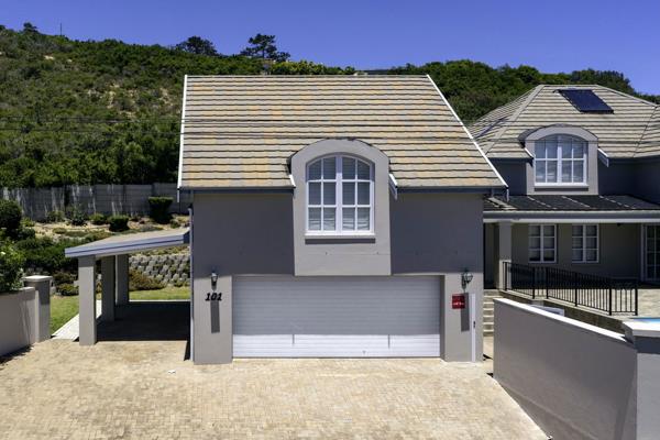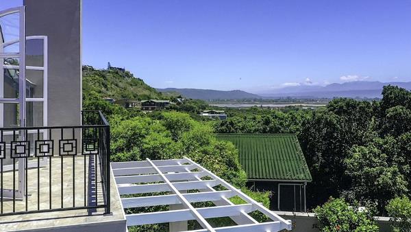 The top level has two double volume bedrooms, both with walk-in closets and ensuite bathrooms. The main bedroom has a full ensuite bathroom. This bedroom leads out onto a balcony with magnificent views of the lagoon, village, Cloud Nine and Outeniqua Mountains. A large study with ample cupboards can be used as third bedroom. Many linen cupboards complete this level. The top level is further lightened with sky lights. All upstairs windows have a mix of wooden shutters & blinds.