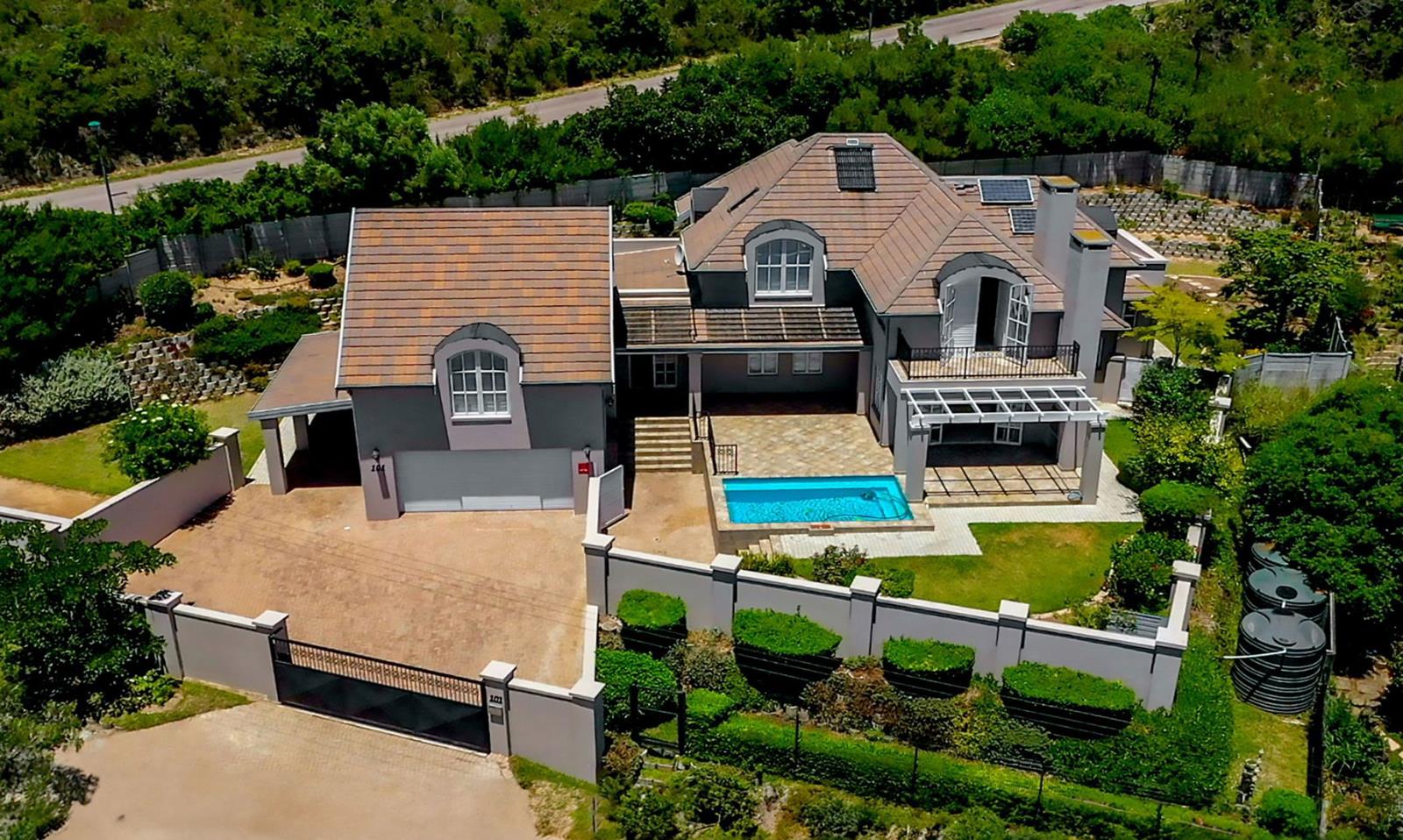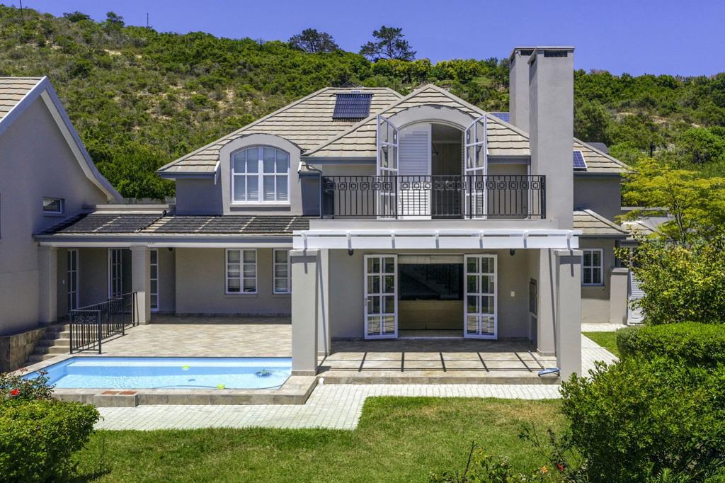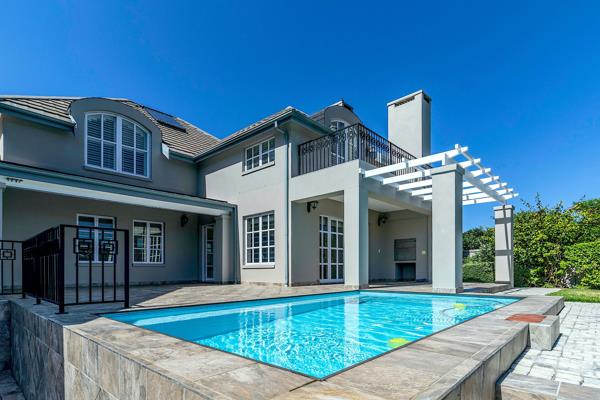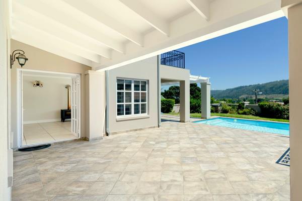 The home is accessible directly from the garage or from the covered front entrance. You are welcomed into an expansive open plan living, dining and kitchen area, with a second living area, with fire place, which flows out onto the covered patio and braai area with pergola-covered area next to the sparkling blue solar heated pool, creating a serene atmosphere and further enhancing the overall appeal of this property.