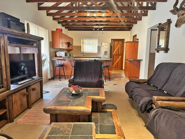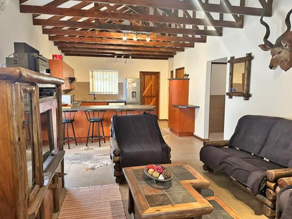This comfortable 2-bedroom, 2-bathroom home main en-suite is thoughtfully designed for easy living. Upon entering, you are greeted by double-volume living areas with exposed beams that create a sense of spaciousness and warmth. Sunlight fills the home through well-placed windows and double doors, brightening every corner.