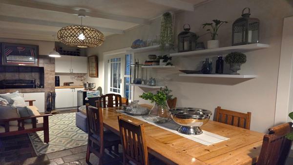 A light-filled braai room with stack doors that open onto a wooden deck and lush garden perfect for entertaining or relaxing