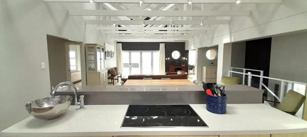 On the top floor, you will find a comfortable lounge/dining area with unobstructed ocean views, a built-in stainless steel braai, and a kitchen with a scullery/laundry. The master bedroom has a full en-suite. The back door opens to wooden stairs leading to the paved backyard with a large boma and views of the green belt.
