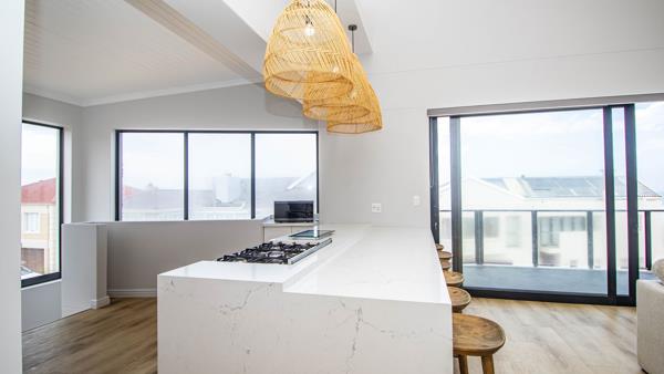 The open-plan living and dining area welcomes you with its spacious layout and natural light, flowing seamlessly to a stylish built-in braaifireplace perfect for year-round entertaining. Step outside to the ocean-facing balcony where sweeping sea views set the scene for unforgettable sunsets.