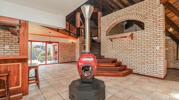 Inside, the open-plan living zone centres around a beautiful ceramic fireplace. A built-in bar opens to the patio for seamless hosting, while the kitchen impresses with granite countertops, solid Brazilian Yellowwood cabinetry, and generous scullery and pantry spaces. A large study, inverter system, and automated irrigation add thoughtful practicality to the homes sophisticated charm.