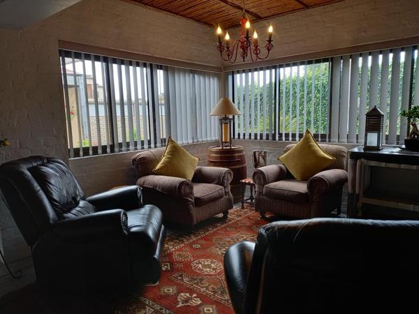 A light-filled sunroom with sliding windows and a built-in braai offers a cozy retreat for year-round relaxation. Outdoors, a covered patio with a second braai facility creates the perfect setting for family gatherings and alfresco entertaining.