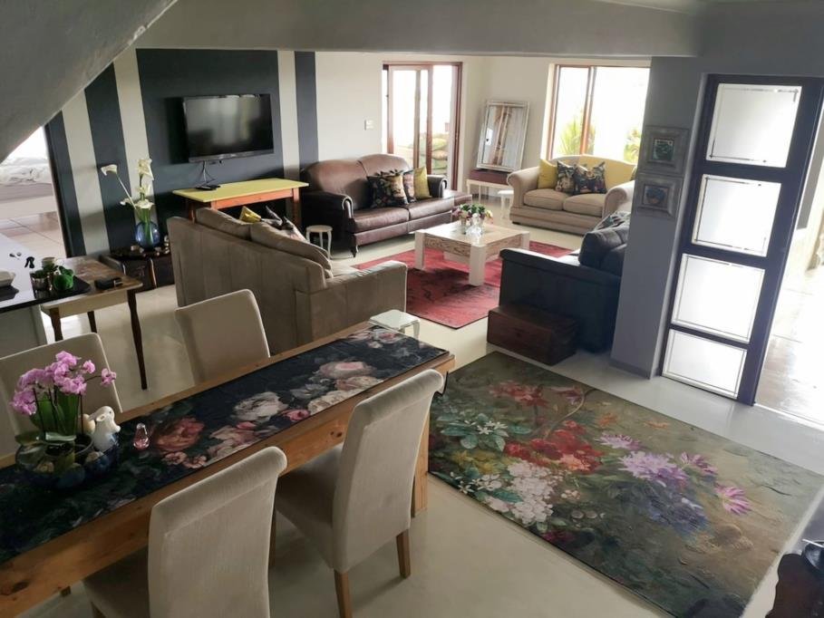 Upstairs, a separate open-plan kitchen and lounge area create a self-contained living space, ideal for guests or as a rental unit. A guest toilet adds convenience. The highlight of the upstairs is the luxurious king-size bedroom with an open-plan bathroom featuring exclusive finishes. Both the lounge and bedroom open onto a large entertainment/braai room, equipped with a built-in braai and a state-of-the-art bar, creating the perfect setting for entertaining and enjoying the coastal lifestyle. An expansive covered balcony offers breathtaking sea views, providing an idyllic spot to unwind and soak in the surrounding beauty.