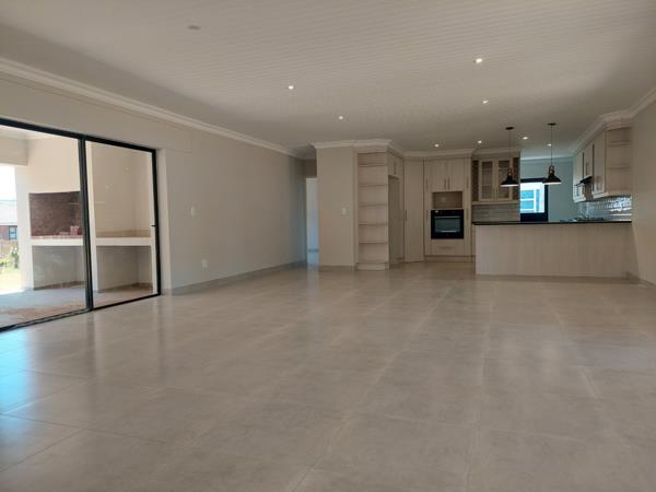 Enter via the covered and shielded veranda into the open-plan living, dining and kitchen area , this spacious are leads outside through sliding doors onto a covered patio, covered and shielded and fitted with built-in braai, perfect for hosting family and friends all year round. Patio steps out to the garden.
