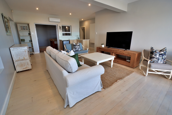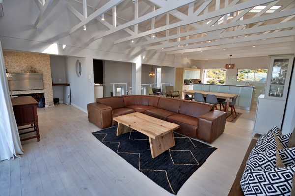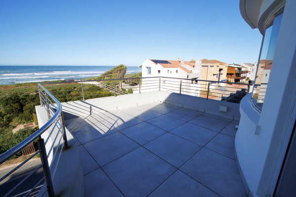 Up the stairs the spacious open-plan living area with open trusses and skylights, creating an airy and bright atmosphere, awaits you. The open plan kitchen is modern with easy quartz tops and a thoughtfully designed layout, catering to the needs of aspiring chefs. The separate scullerylaundry room has access to the back balcony, providing practicality and functionality. The living area is made up of the dining area and lounge where you can gather with loved ones and enjoy the breathtaking views. Stacking doors open to the patio balcony, seamlessly blending indoor and outdoor living spaces. Off to the side is a built-in bar and braai room, perfect for hosting unforgettable gatherings. The jacuzzi on the balcony is your private oasis to unwind and soak in the beauty of the surroundings. The main bedroom with full en-suite bathroom and own door to the balcony, allows you to indulge in the stunning sea views. The guest toilet is for the added convenience of all. There is access from the kitchen to the back balcony, leading to the outside braai and fire pit overlooking the green belt area, creating a serene and picturesque ambiance. Wooden floors throughout the house add warmth and charm to the already inviting spaces.