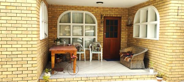 The wooden stairs lead to a loft, a private area suitable for a third bedroom or private study, and a door opening to a covered patio with views of Stilbaai Town.