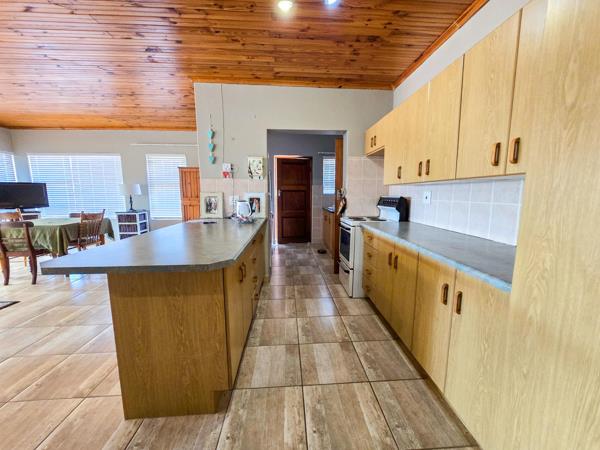 The open-plan kitchen and living area create a seamless flow, leading to a fully enclosed patio with a built-in braai. An excellent space for entertaining family and friends in any weather. From this area, you can enjoy beautiful distant sea views over Stilbaai.
