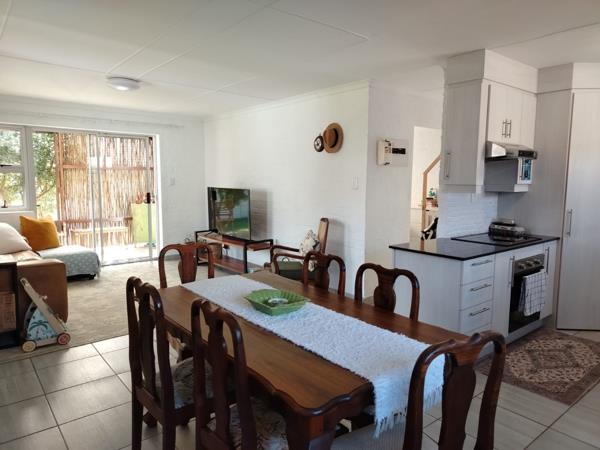 Inside, the open-plan living, dining, and kitchen area is filled with natural light. The kitchen boasts enough built-in cupboards to spare, a convenient pantry cupboard, granite countertops, and an electric oven and hob perfect for everyday cooking. A passage leads to two generously sized bedrooms and the family bathroom with bath, basin and toilet. The sunny main bedroom features built-in cupboards, block-out blinds, an en-suite bathroom with shower, basin, and toilet, plus direct access to a private wooden deck and to the well maintained spacious garden. The second bedroom is fitted with built-in cupboards and block-out blinds. An automated single garage with in-house access and neatly paved driveway round off this beautiful house.