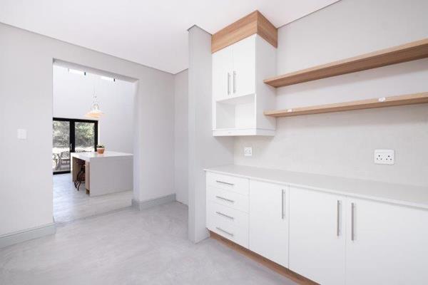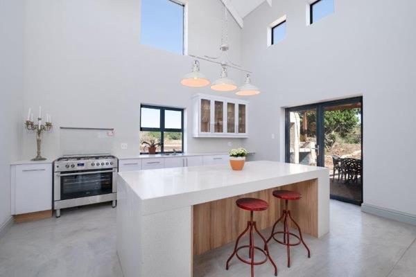 The home features open-plan living and dining area that boasts double volume ceilings with exposed trusses, clean lines, and an abundance of natural light. The modern kitchen is both functional and elegant with granite counter tops, enough cupboards to spare and a large center island, free standing gas stove and high-quality finishes. A spacious, out-of-sight scullery provides ample storage and keeps the main kitchen clutter-free. All three bedrooms are generously sized and fitted with built-in cupboards. The main bedroom boasts a full en-suite bathroom, and opens up to the enclosed shielded and covered private patio. The patio is fitted with a built-in braai and makes for outdoor entertaining all year round.