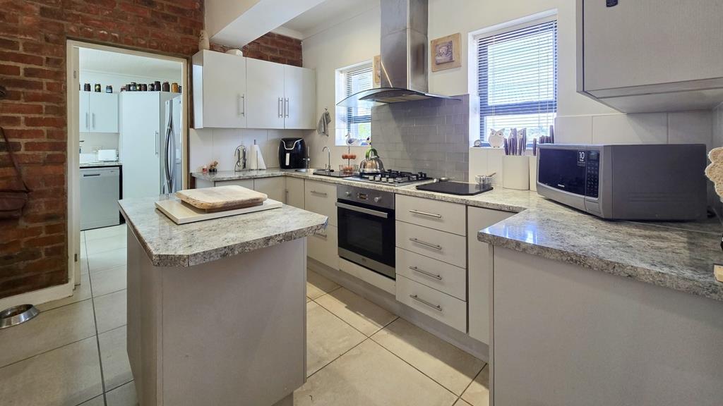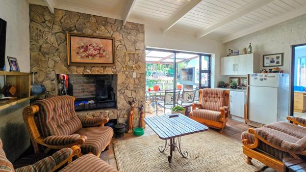 The home features a spacious open-plan living, dining, and kitchen area, designed for easy flow and everyday comfort. The kitchen includes a separate washing-up/scullery area, adding to the homes practicality. A cosy indoor fireplace nook creates the perfect atmosphere for winter evenings, while an undercover outdoor braai area allows for year-round entertaining. The property also offers a separate study, ideal for a home office or quiet workspace, as well as a double garage and a well-kept low-maintenance garden.