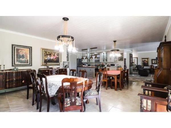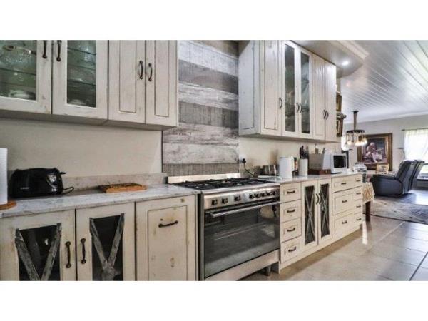 The spacious open-plan living and dining areas flow effortlessly into a stylish kitchen, complete with a central island, ample built-in cupboards, a gas stove, and a separate scullery for added practicality.