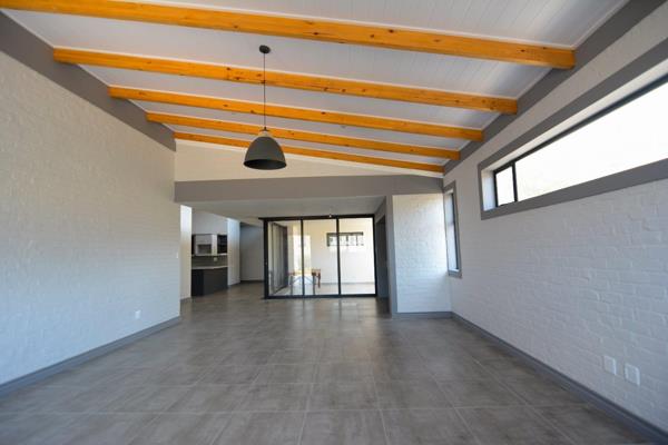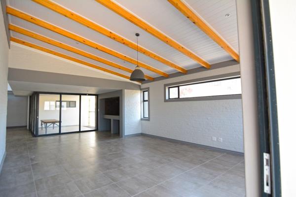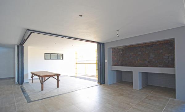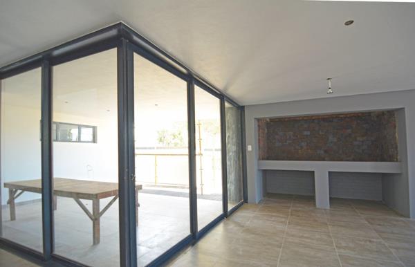 The indoor entertainment area features an extra-large built-in braai/fireplace, perfectly positioned within the kitchen, dining, and lounge space for effortless hosting.