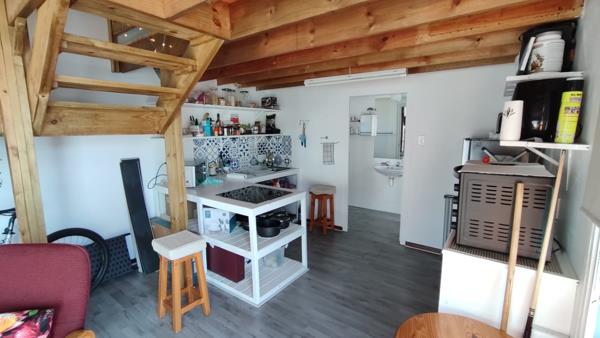 The upstairs bedroom features an en-suite bathroom and an open-plan lounge area, creating a private and cozy retreat. Downstairs youll find a second bathroom, along with an open-plan kitchen and lounge area that flows seamlessly through a sliding door onto an open deck. The built-in braai on the deck is perfect for entertaining or relaxing while enjoying the serene surroundings.