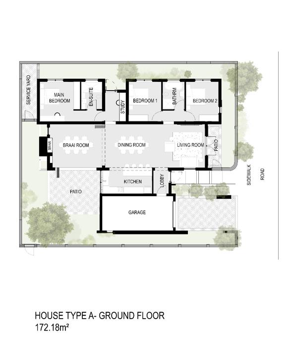 Choose your preferred plot and create a home that suits your lifestyle. This thoughtfully designed layout, known as A1 is perfect for a erf from 323.45 sqm it includes three spacious bedroomsfeaturing a main suite with en-suite bathroomplus an additional bathroom and study. The open-plan living and dining areas flow seamlessly into a stylish kitchen, braai room, and covered patio, perfect for relaxed indoor-outdoor entertaining.