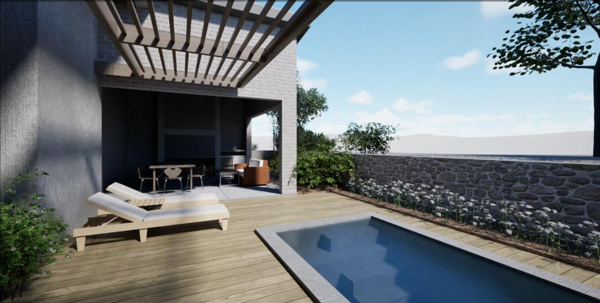 3 Bedroom, 2.5 bathroom with double garage. Braai room. Gated complex surrounded by greenbelt, all plots facing north. Distant ocean views. No transfer duty.