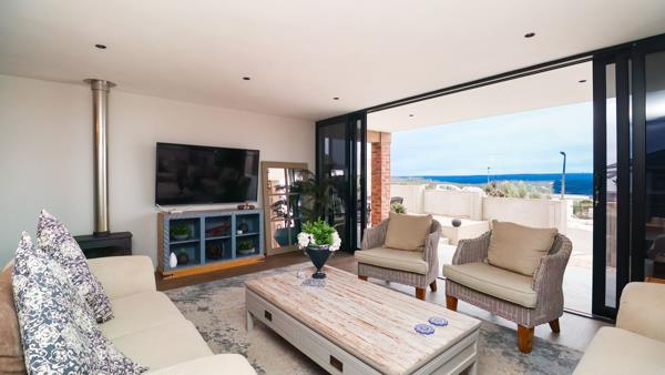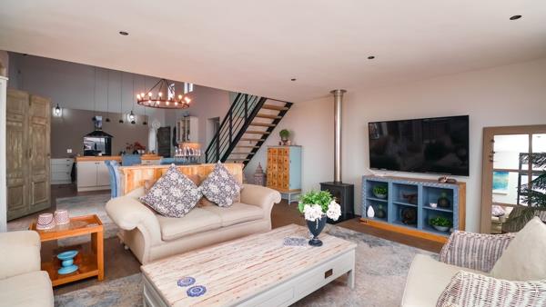 Every element of the home speaks of quality, from the custom-designed meranti wood doors with glass or mirror inlays, to the soft-close sanitary ware in the beautifully finished bathrooms. Vinyl flooring runs throughout, complementing the warm tones of the wood. The lounge, with its cozy wood-burning fireplace, flows seamlessly onto a covered balcony through sliding doors, offering breathtaking views of the river and the Langeberg Mountain range.