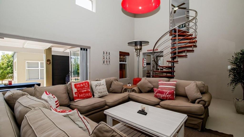 The main double-storey home is spacious and elegant, featuring four bedrooms and four bathrooms, three of which are en-suite. Designed with open-plan living in mind, the kitchen and lounge flow seamlessly into a welcoming entertainment area with a covered braai patio, perfect for hosting friends or simply enjoying laid-back evenings with family. Balconies invite you to soak in the serene surroundings, while direct access from the double garage adds everyday convenience.