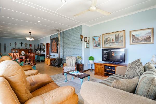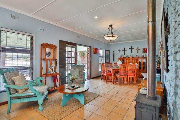 The bright and airy open-plan living and dining area, complete with a cosy fireplace, flows seamlessly onto a semi-enclosed patioone of the homes standout features. With its striking river outlook and built-in braai, its the perfect spot for year-round relaxation or entertaining.