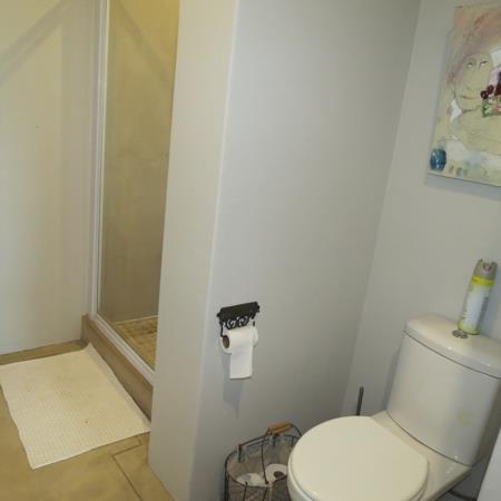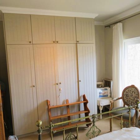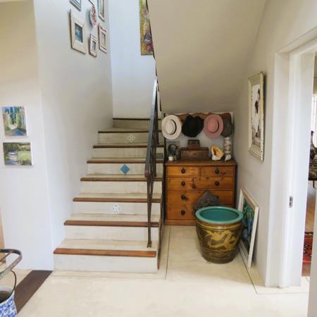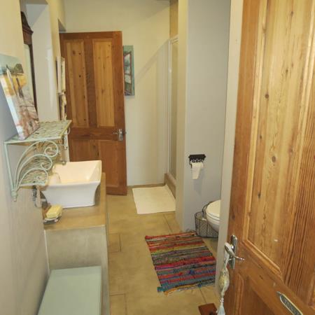 Upstairs, a spacious dining area flows into a charming, farm-style kitchen complete with a six-plate gas stove and extractor fan. An interleading door opens onto a balcony with a built-in braai, creating the perfect setting for relaxed entertaining.