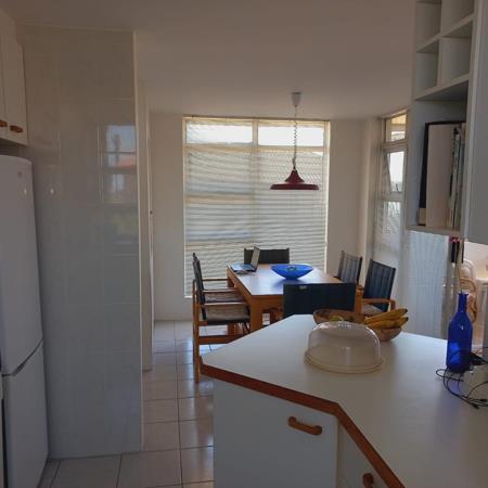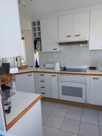 The kitchen is neat and functional, offering ample cupboard space and a breakfast counter overlooking the dining area.