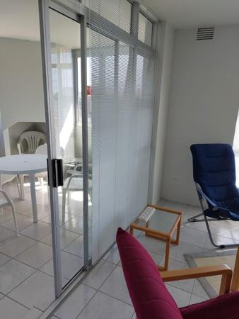 The property features two well-sized bedrooms and two bathrooms, providing privacy and convenience for residents or guests. Large windows fitted with blinds allow natural light to flood the interior, creating a bright and airy atmosphere.