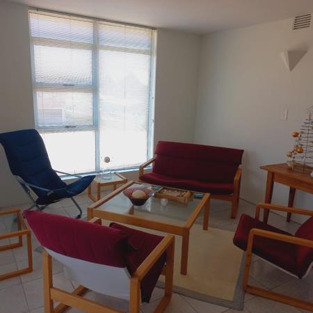 The spacious living area comfortably accommodates a full lounge suite and additional seating, creating a welcoming space to relax.