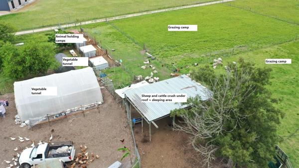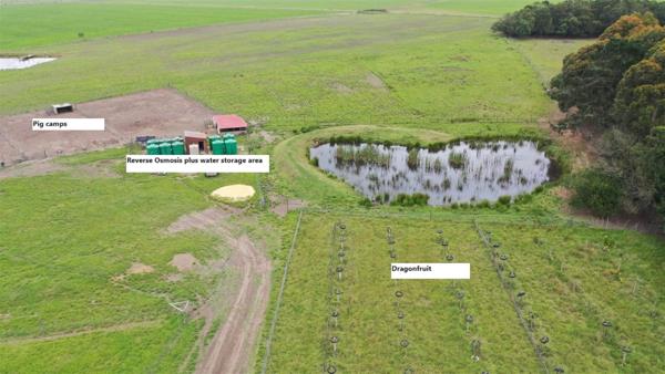 of a hectare has been planted with dragon fruit while there are 5 other grazing camps, differing in size. There are 4 camps for the pigs, each with its own underroof area for shelter. Water is supplied to all 3 camps via two 1 000l flow bin tanks and pig water nipples.
