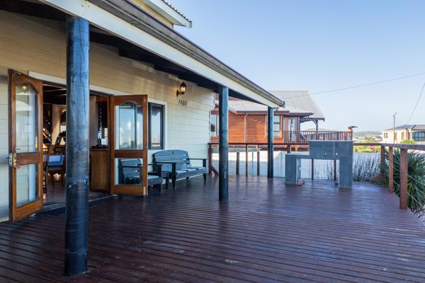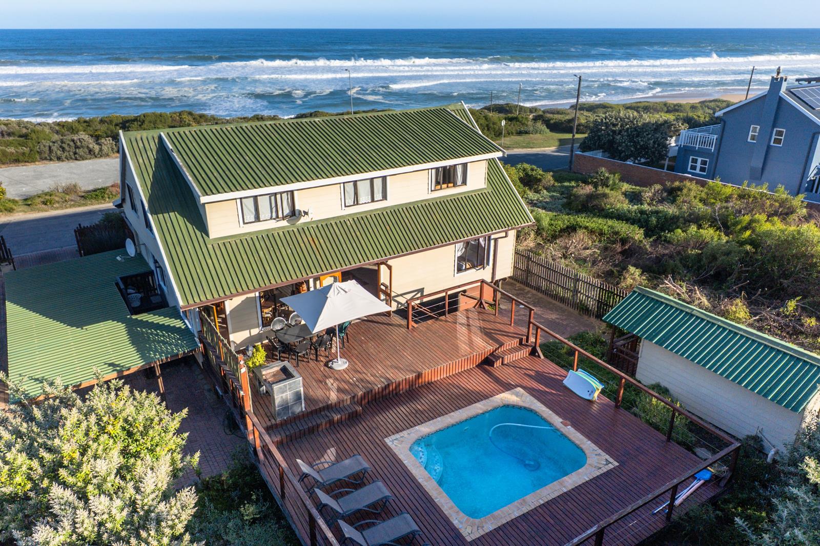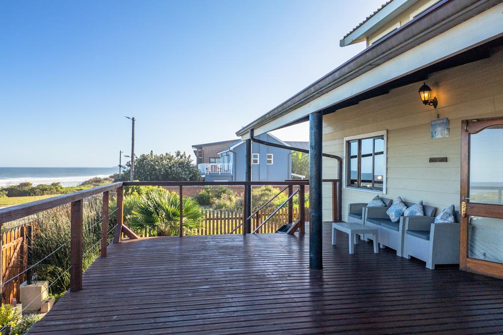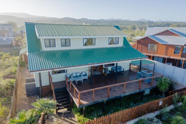 Perched on the edge of the Indian Ocean, this stunning seafront home in Kleinkrantz, Wilderness offers breathtaking views of the coastline and surrounding landscape.