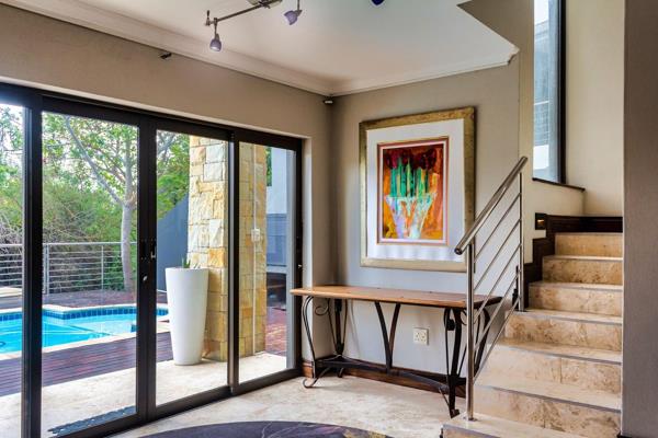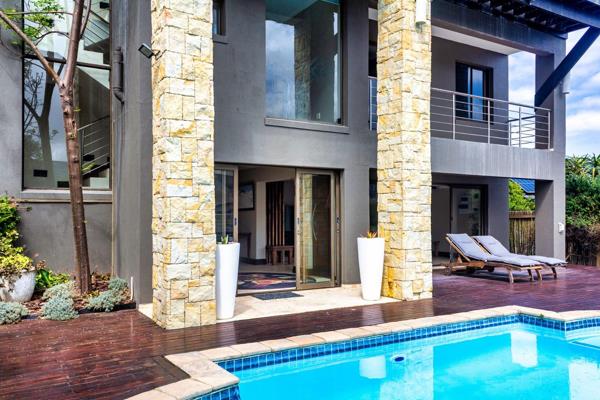 The expansive ground floor features a private en-suite guest suite with patio access, a stylish bar, and a dedicated wine cellar. An air-conditioned lounge opens onto a spacious deck, boasting a north-facing swimming pool, integrated braai area, and a fire pit perfect for sheltered outdoor living.