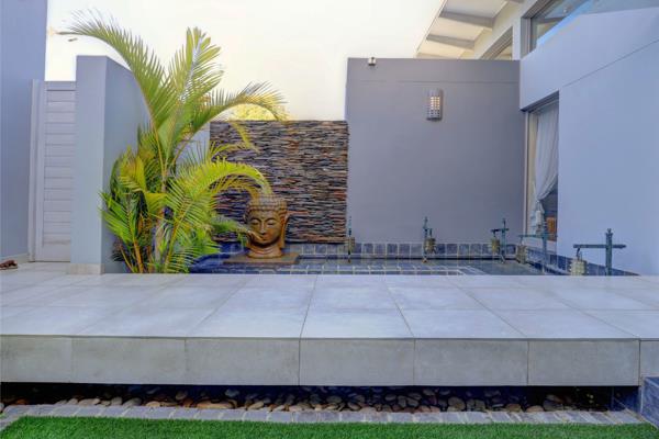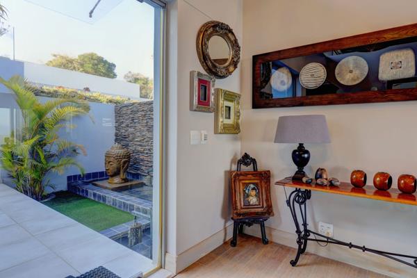 Youre welcomed to this beautiful home through a unique, double-door entrance, where you step down into a tranquil, protected patio with a serene water feature a calm prelude to what awaits inside. From here, living spaces flow seamlessly open, airy and inviting. A statement wood-clad feature wall anchors the living room, concealing clever cabinetry and a sleek gas fireplace. Glass doors open to an enclosed entertainment patio and expansive front deck, where a heated pool and frameless glass balustrades offer uninterrupted ocean views. Dual dining areas, a built-in braai and pizza oven, bespoke bar, and a relaxed lounge with a combustion fireplace make this home ideal for entertaining, quiet mornings, or long, laughter-filled evenings. A conveniently positioned guest bathroom and steam room add everyday indulgence.
