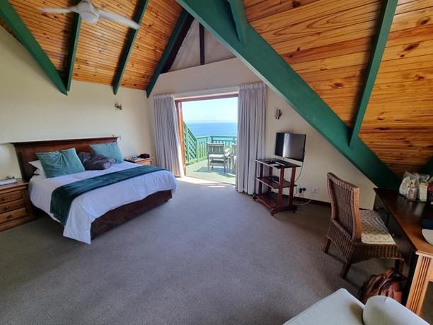 The living spaces feature a cosy lounge with a wood fireplace, a dining room, and a fully equipped kitchen. The villa boasts breathtaking 360-degree views of the beach, mountains, and lagoons, accessible from its viewing decks on the ground and top floors. Outdoor features include a braai patio, and construction of a private splash pool will begin in early 2025.