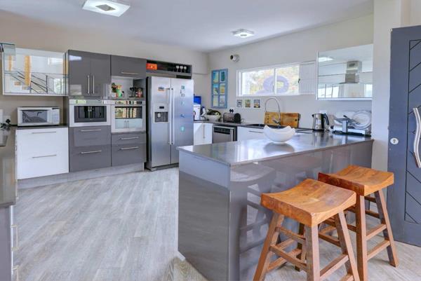 The ground floor consists a grand double-volume entrance hall featuring a striking staircase. Enjoy a cozy TV room with views of the sea and garden, an open-plan entertainment area perfect for a pool room, and a newly refurbished kitchen with vinyl flooring, ample cupboard space, and a charming breakfast nook. The separate scullery room is equipped with a Victron inverter system (5KV) and lithium iron batteries to counter load shedding. Additional highlights include a sunlit dining room with seamless stacker doors opening up to awe inspiring sea views, a lounge with a fireplace, two interconnecting en-suite family bedrooms with modern amenities, and a guest toilet.