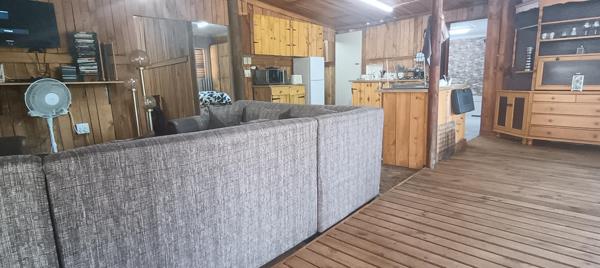 The home features a warm and inviting open-plan living area with wooden finishes, creating a relaxed holiday atmosphere. The kitchen flows naturally into the living space, making it ideal for spending quality time with family and friends after a day on the dam.