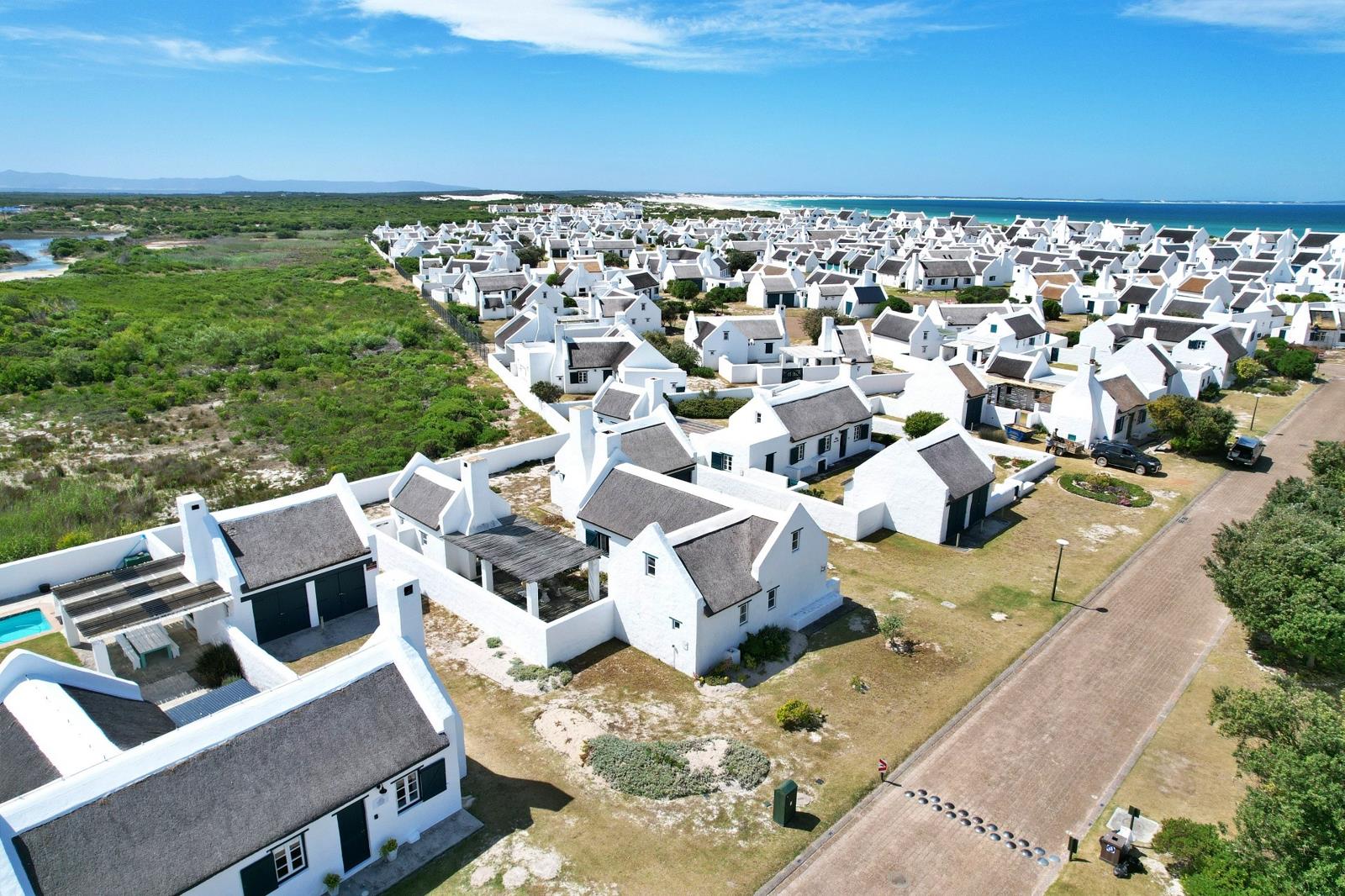 The very essence of the Langezandt estate is a meticulous celebration of heritage and beauty. The architecture, inspired by the classic Cape Dutch style, creates an immediately picturesque and cohesive environment. The signature combination of crisp white-washed walls and rustic thatch roofs is beautifully maintained throughout, casting an ambiance of timeless serenity. Strolling through the village feels like stepping into a curated work of art, designed to inspire peace and admiration in equal measure.