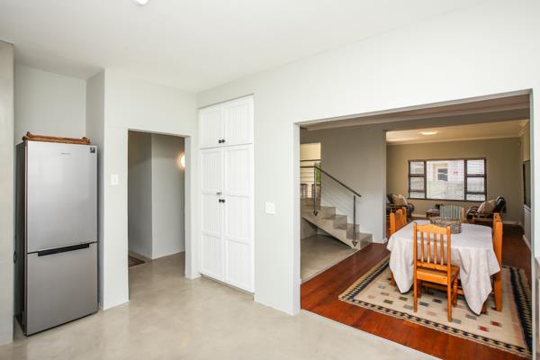 Ascend the newly constructed staircase to discover a second entertainment area, perfect for hosting gatherings. This versatile space boasts an indoor braai, stacker doors leading to a balcony with sea views, and ample room for a dishwasher and prep area. A guest toilet adds to the convenience.
