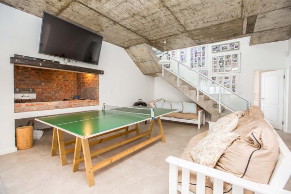 Downstairs, there is a spacious entertainment room with a large indoor braai and doors leading out to the pool.