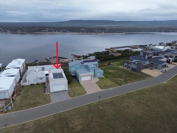This modern riverfront home in Breedezicht Estate features open plan living, an enclosed braai area with built-in braai and louvre roof, a fireplace, and folding doors leading to a patio with stunning river and estuary views.