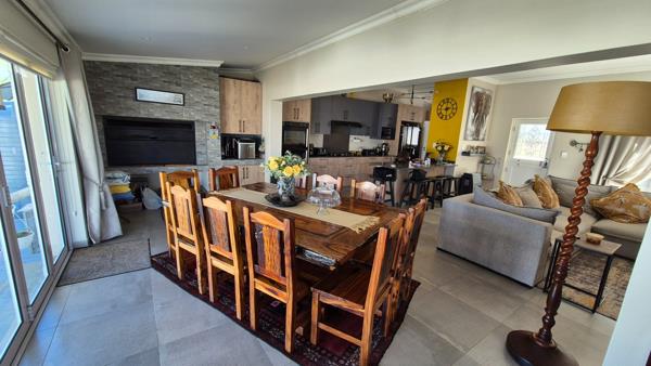 Step into a spacious open plan living area that features a welcoming TV lounge with a cosy fireplace, alongside a dining area complete with a built-in braai, perfect for relaxed gatherings.