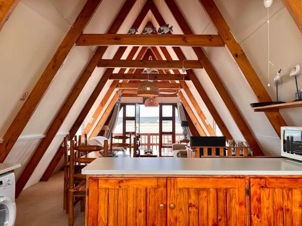 Upstairs is the true heart of the home, where stunning views of San Sebastian Bay and the Breede River create a breathtaking backdrop. The open-plan layout includes a well-equipped kitchen designed for entertaining, a spacious dining area, and a comfortable lounge all bathed in natural light.