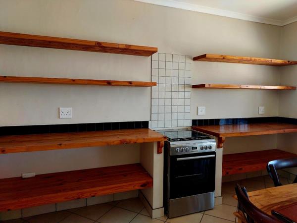 The durable tiled flooring extends throughout, offering easy maintenance. The functional kitchen boasts a rustic aesthetic with ample open wooden shelving, practical wooden countertops, a freestanding oven/stove, and a farmhouse-style sink, perfect for both everyday living and entertaining. The home is offered semi furnished, ensuring a seamless move-in experience.