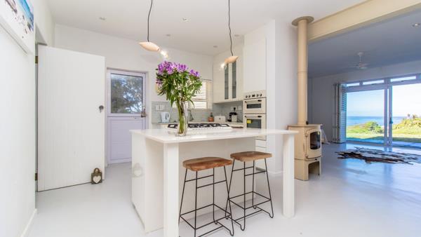 The main suite upstairs has views across the ocean to Danger Point/Hangklip lighthouse to the west incl the cape of Sea Farm. The free-standing bath has sizable corner windows making bathing in the light of the Full Moon a new experience.