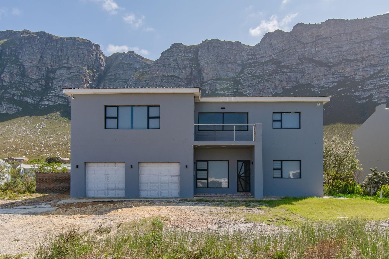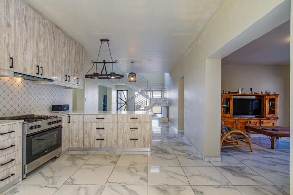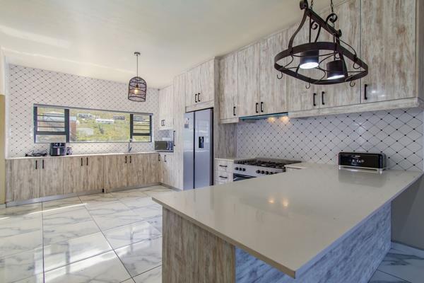 Straight ahead the large open plan kitchen with a free-standing gas and electric stove and ample cupboard space forms the heart of the home. Leading off the kitchen a separate scullery offers extra cupboard space. The dining room located to the right of the entrance hall boasts amazing sea views to add to the ambience. The sunny living room is fitted with stacker doors opening directly onto a covered veranda and enclosed braai and boma area, with ample seating for entertaining on those idyllic Summer evenings.