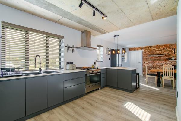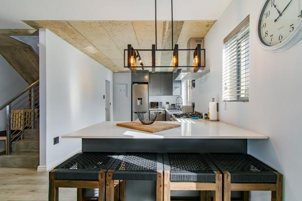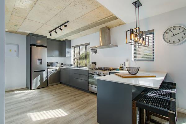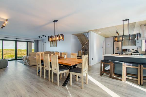 The living area seamlessly extends to a lovely balcony featuring a built-in braai, ideal for alfresco dining and entertaining, while providing access to the back garden filled with natural fynbos.