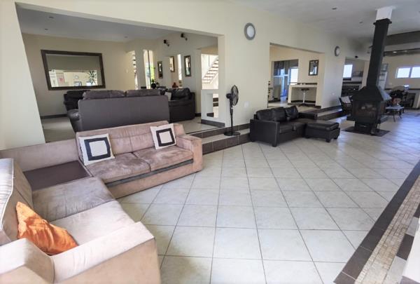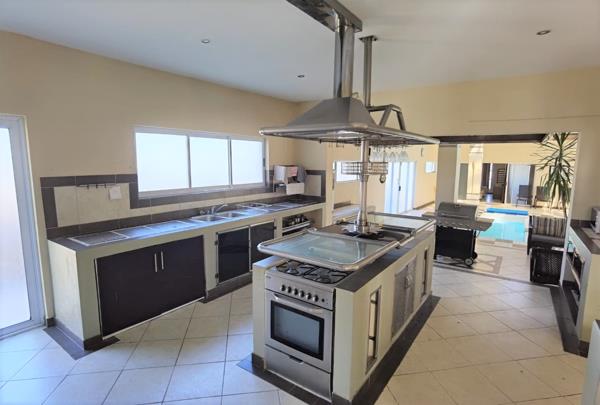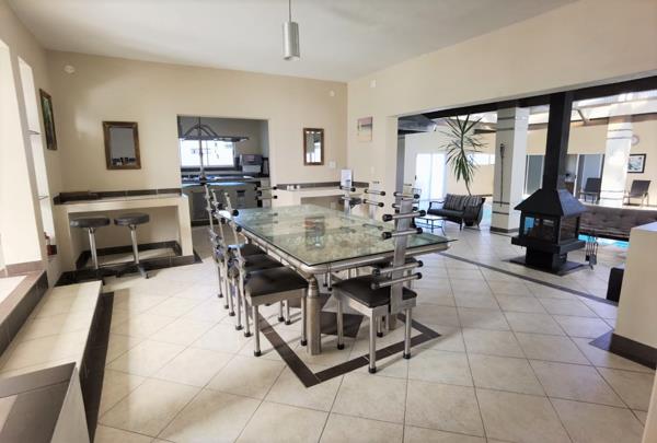 This design around the pool area makes it a very exciting home. Loads to explore from the well-equipped kitchen, pool room, bar, lounges, and braai areas. The double volume ceilings give this home loads of light.