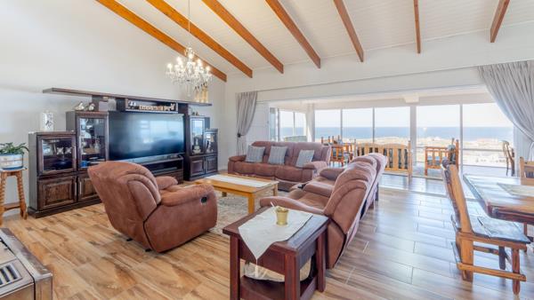 On the main level, a double garage with a remote-controlled door offers direct access into the home. The open-plan kitchen, dining and living area flows elegantly into a light-filled enclosed entertainment room featuring panoramic 180 sea views and a built-in braai -- perfect for relaxed gatherings.